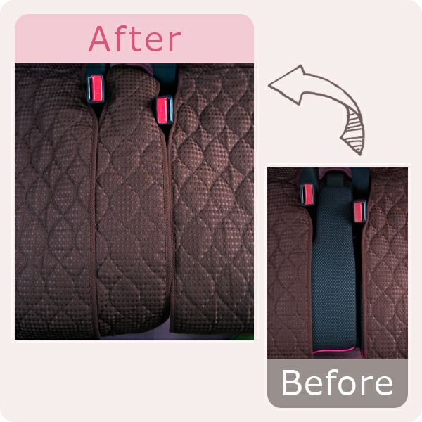 シートカバーを取り付けた運転席と助手席の間にベンチシート用すき間パーツをセットします。 運転席側シートカバーの裏面にすき間パーツの面ファスナーをしっかりと取り付ければ完成です。