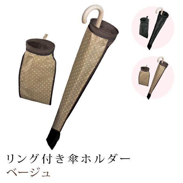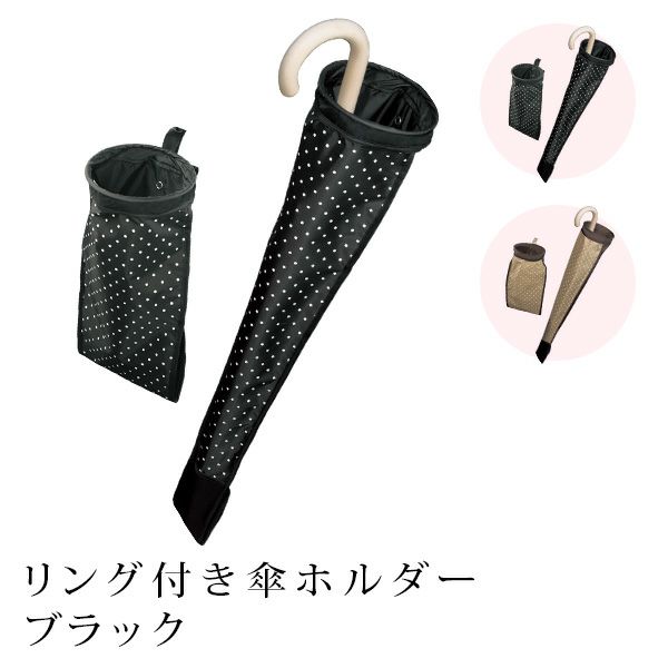 リング付き傘ホルダーのご紹介です。口に丸型のリングが付いているので、閉じただけの傘が楽に入ります。長さが2段階に調節できるので、折り畳み傘にも対応。吊り下げに便利な面ファスナーストラップ付き。