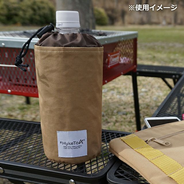 内側は保冷効果のあるアルミシート素材で、口の部分は巾着状になっており締められる形状となっています※ペットボトルは付属していません。