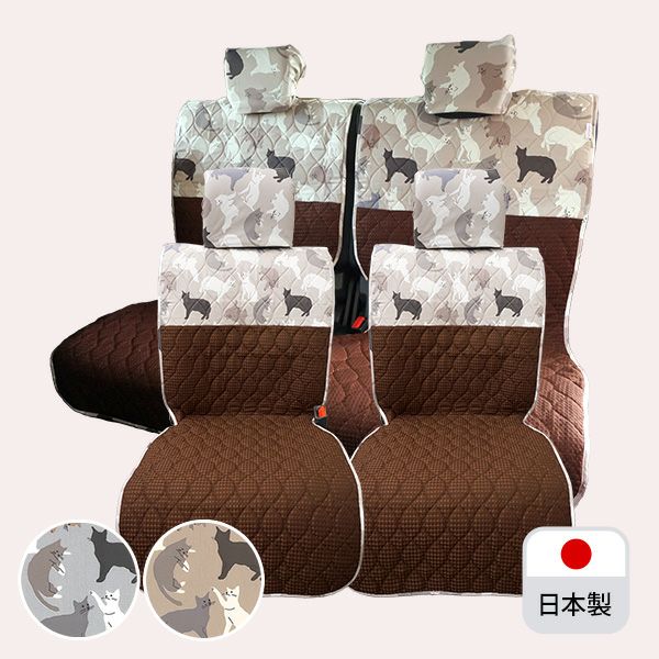 シートカバー前後セットのご紹介です。後部座席は軽自動車用です。生地の間にウレタンを挟んだ厚みのある素材で、複数の固定パーツでシートにしっかり固定します。 シートカバー前後セット 軽自動車用(前座席 + 後部座席)/ねこ柄