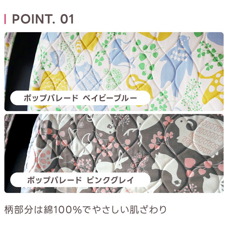 面ファスナー付きストッパーで、シートカバーのズレを防止