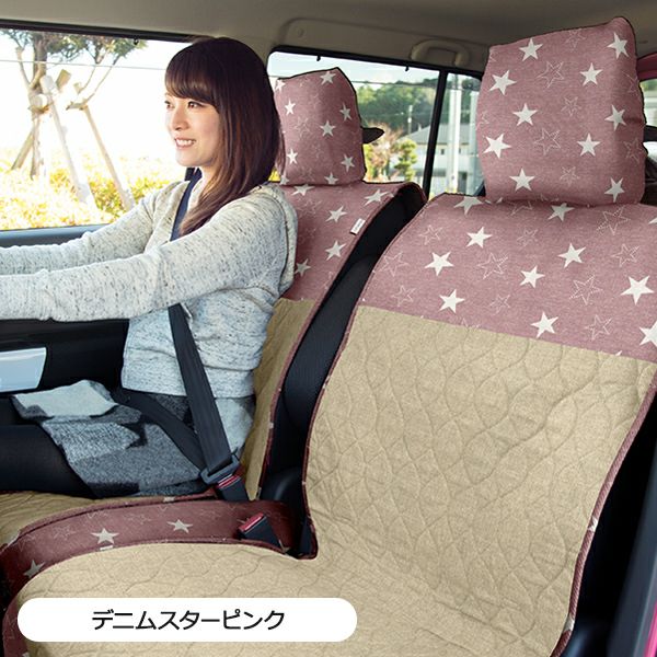 軽自動車向けの前座席用シートカバー2枚セットのご紹介です。生地の間にウレタンを挟んだ厚みのある素材で、複数の固定パーツでシートにしっかり固定します。ハイセンスでかわいい星柄! 【12/25までクリスマスキャンペーン対象品】前座席用シートカバー(軽自動車・普通車・コンパクトカー用)/デニムスターピンク×コルクホワイト【アウトレット/在庫限り】