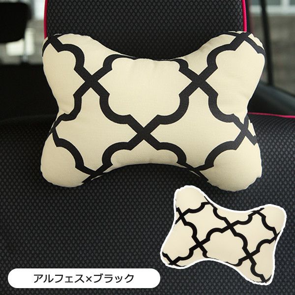 ネッククッションのご紹介です。リボンのような形が可愛いクッションで、ヘッドレストに簡単に装着でき、長時間ドライブで疲れがちな首を支えます。シンプルなモロッカンスタイル。 【12/25までクリスマスキャンペーン対象品】ネッククッション/アルフェス柄