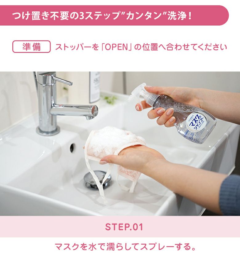 "皮脂・化粧・食べ物の汚れまでスッキリ洗浄!スプレーして、やさしくこすって、すすぐだけ!有効成分「塩化ベンザルコニウム(0.05w/v%)」配合。日々のマスクの除菌・消臭対策! " 【送料無料】マスクのシャンプー3本セット