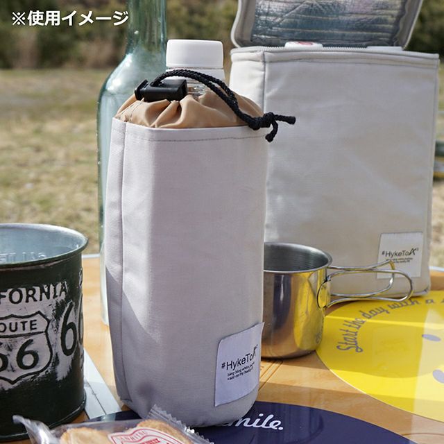 内側は保冷効果のあるアルミシート素材で、口の部分は巾着状になっており締められる形状となっています※ペットボトルは付属していません。