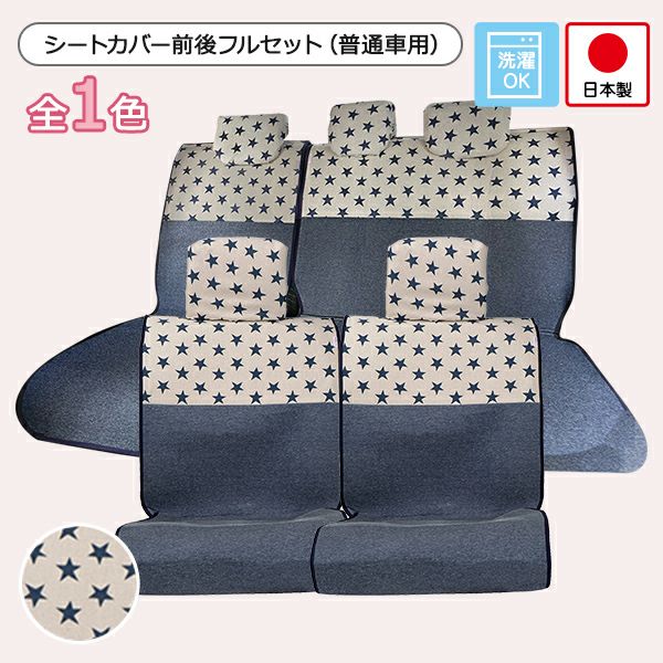 シートカバー前後セットのご紹介です。後部座席は普通車コンパクトカー用です。生地の間にウレタンを挟んだ厚みのある素材で、複数の固定パーツでシートにしっかり固定します。 シートカバー前後セット 普通車コンパクトカー用(前座席 + 後部座席)/スターネイビー柄【アウトレット/在庫限り】