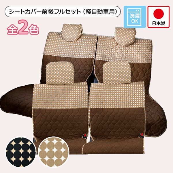 シートカバー前後セットのご紹介です。後部座席は軽自動車用です。生地の間にウレタンを挟んだ厚みのある素材で、複数の固定パーツでシートにしっかり固定します。 シートカバー前後セット 軽自動車用(前座席 + 後部座席)/ドット柄