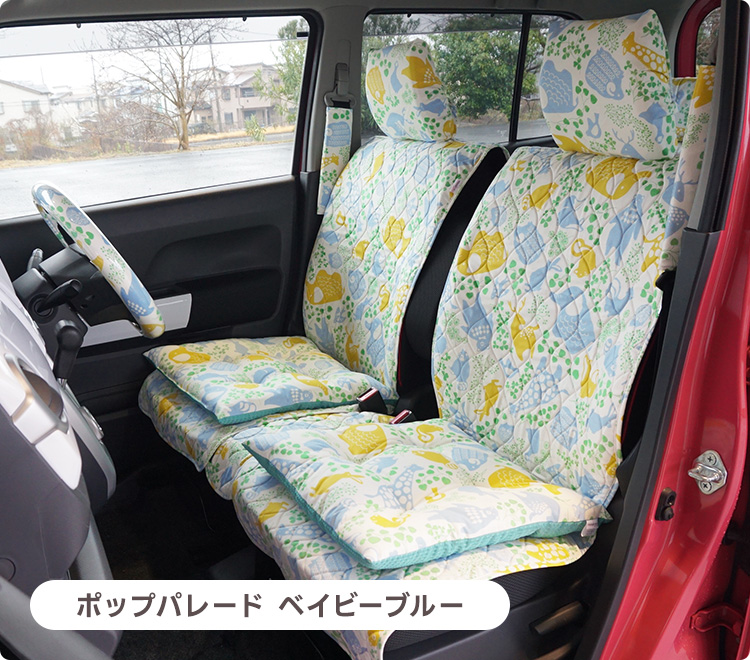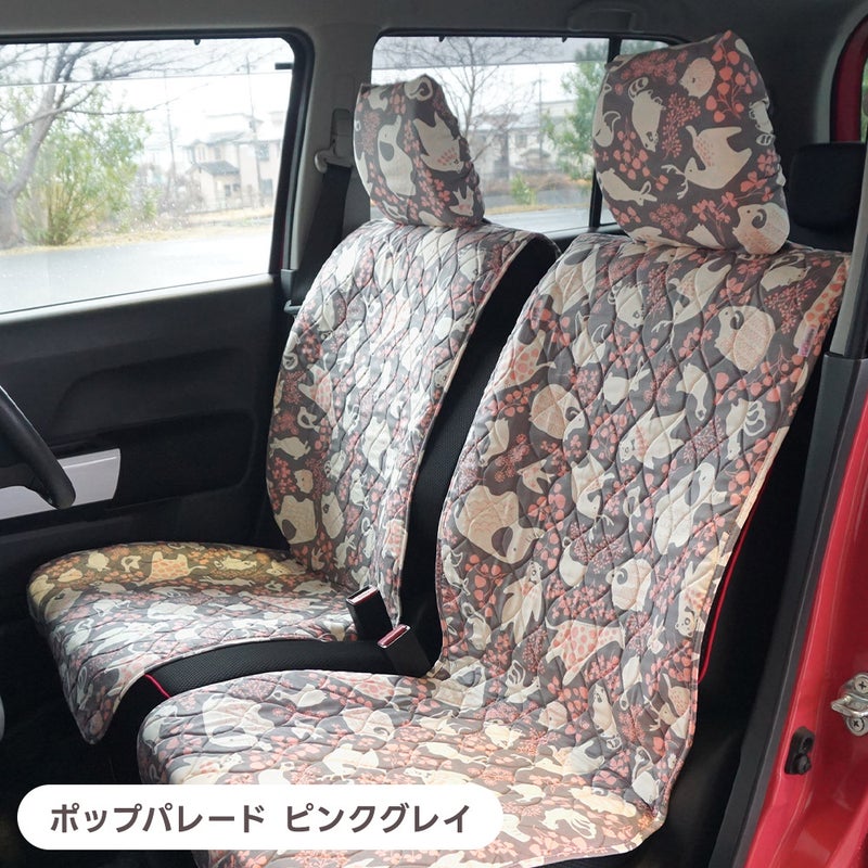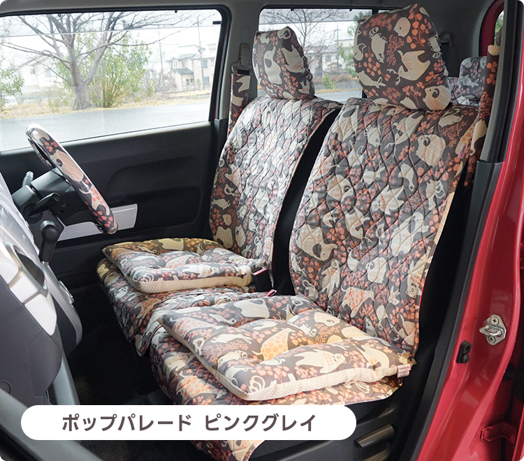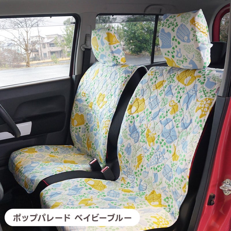 シートカバー前後セットのご紹介です。後部座席は軽自動車用です。生地の間にウレタンを挟んだ厚みのある素材で、複数の固定パーツでシートにしっかり固定します。 シートカバー前後セット 軽自動車用(前座席 + 後部座席)/ポップパレード柄(アニマル)