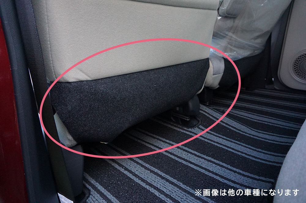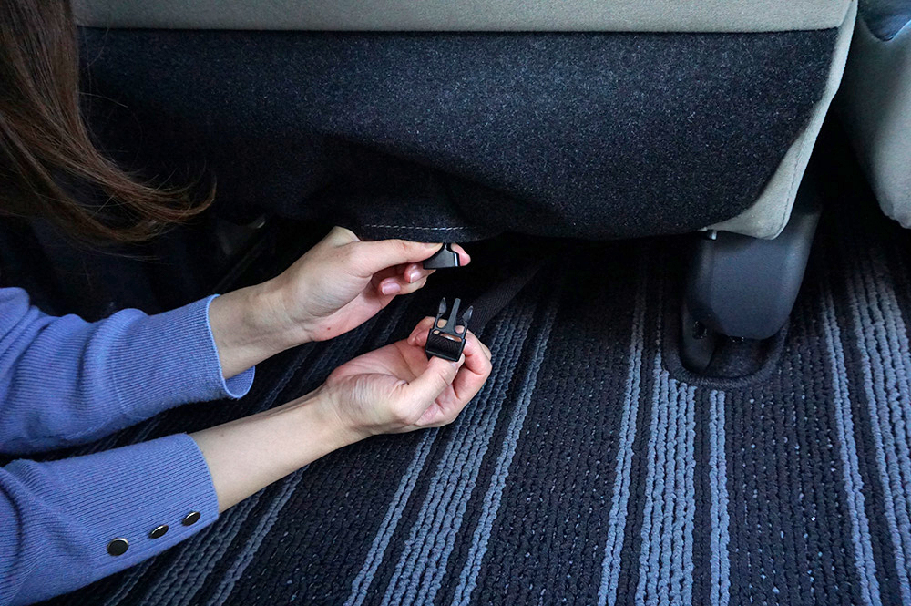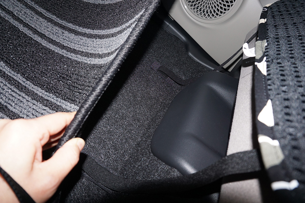 ミラトコットの後部座席は、左右の座席が独立しておらず、座面が一体型のシートになっているので座席部分に留めるゴムバンドは、床に留める方が綺麗に装着できます!