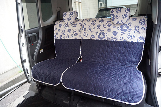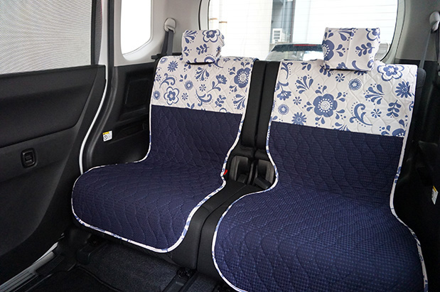 今回装着したシートカバーの柄はミミパレットネイビー柄です。サイズもぴったりで、綺麗にフィットしています。