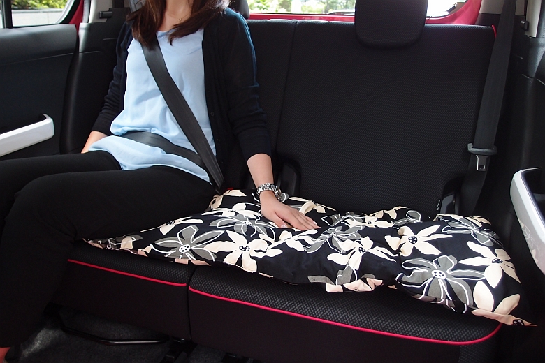 後部座席用のロングシートクッションは、2枚あればテント内のマット代わりにも使えます。肉厚なので、地面の凹凸もカバーして、冷たさもシャットアウトできて快適に!