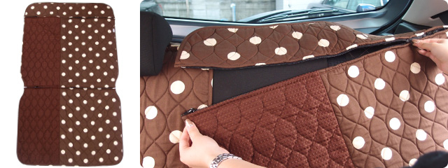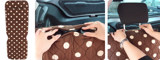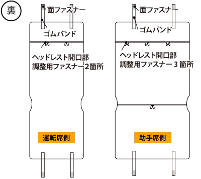 シートカバーをかぶせ、ヘッドレスト開口部のファスナーを開けます。