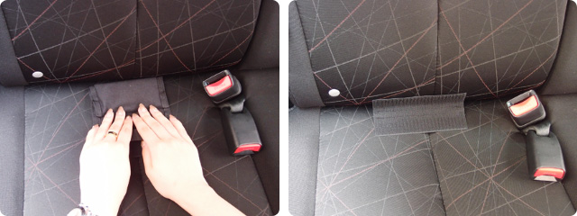 背もたれと座面の間のファスナーを開け、シートベルトを通します。