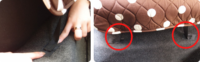 シートカバー両サイドの面ファスナー付きゴムバンドを引っ張りカバー裏地にしっかりと取り付けます。
