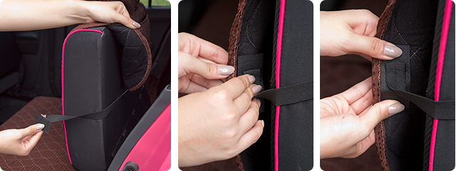 シートカバー両サイドの面ファスナー付ゴムバンドを引っ張り、カバー裏地にしっかりと取り付けます。