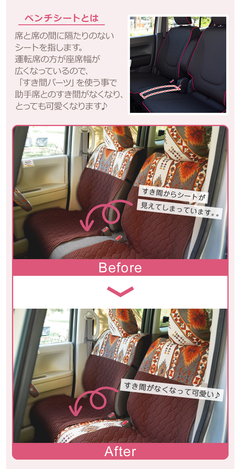 【NBOX・NBOXカスタム(ベンチシートタイプ)】はその名の通り、前座席がベンチシートになっているため、前座席ベンチシート用 すき間パーツの装着をおススメしています。