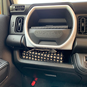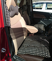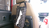赤の車を購入したので、車内は可愛くなりすぎないようモダンな黒ドットでコーディネートしました。