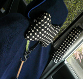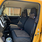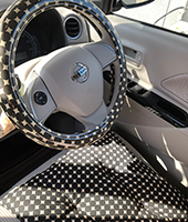 赤の車を購入したので、車内は可愛くなりすぎないようモダンな黒ドットでコーディネートしました。