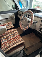 4年前に購入したハンドルカバーがお気に入りで、新車にもそのまま取り付けました!同じデザインのクッションを購入し、車内空間を可愛くしてみました☆