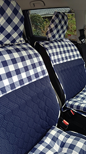 クルマを買い替えることになり、シートカバーを探していました。ココトリコさんのネイビーチェックが私の好みにぴったりで即決しました。12月10日にシートカバーだけじゃなくクッションもお揃いでお願いしました。