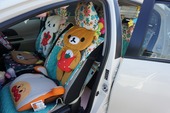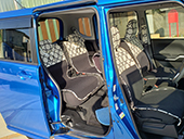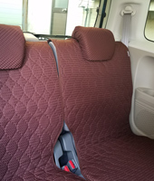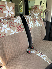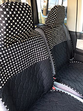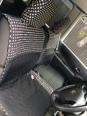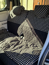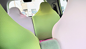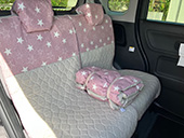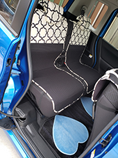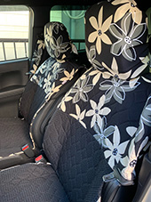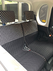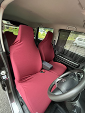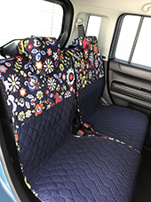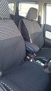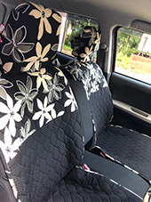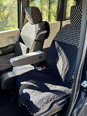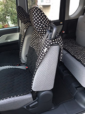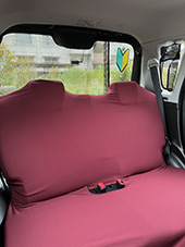 車の内装を可愛くしたくてネットで色々探しましたが、一番自分の好みなのがココトリコさんの商品でした。初代はリトルフフラチョコのシートカバーを前後購入し、8年ほど愛用しました。この度、車の乗り換えを気に新たにポルカブラックを購入。シートカバーがしっかりとしていて好きなのですが、スペーシアギアの助手先の下には収納BOXがあり、シートカバーをつけてしまうと開けれなくなるので仕方なく前だけはハイバックシートクッションにしました。やっぱり乗り降りのたびにめくれるのが気になりますね。あと収納BOXもあまり頻回にはあけれなさそうです。バンダナは全席に着けることにしましたが、初代よりも大きさが半分になっているのが残念です。