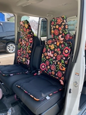シートカバーと同じデザインのバンダナ付きっていうのもとてもいいなぁと思いました、ただマツダのフレアクロスオーバーは前座席用のヘッドレストが縦が普通の車より長くできてるので、バンダナがちいさかったです、全部おおえたらよかった、、。